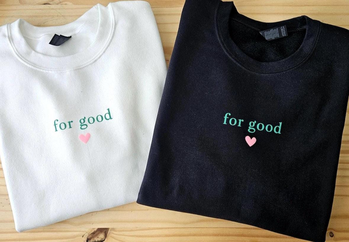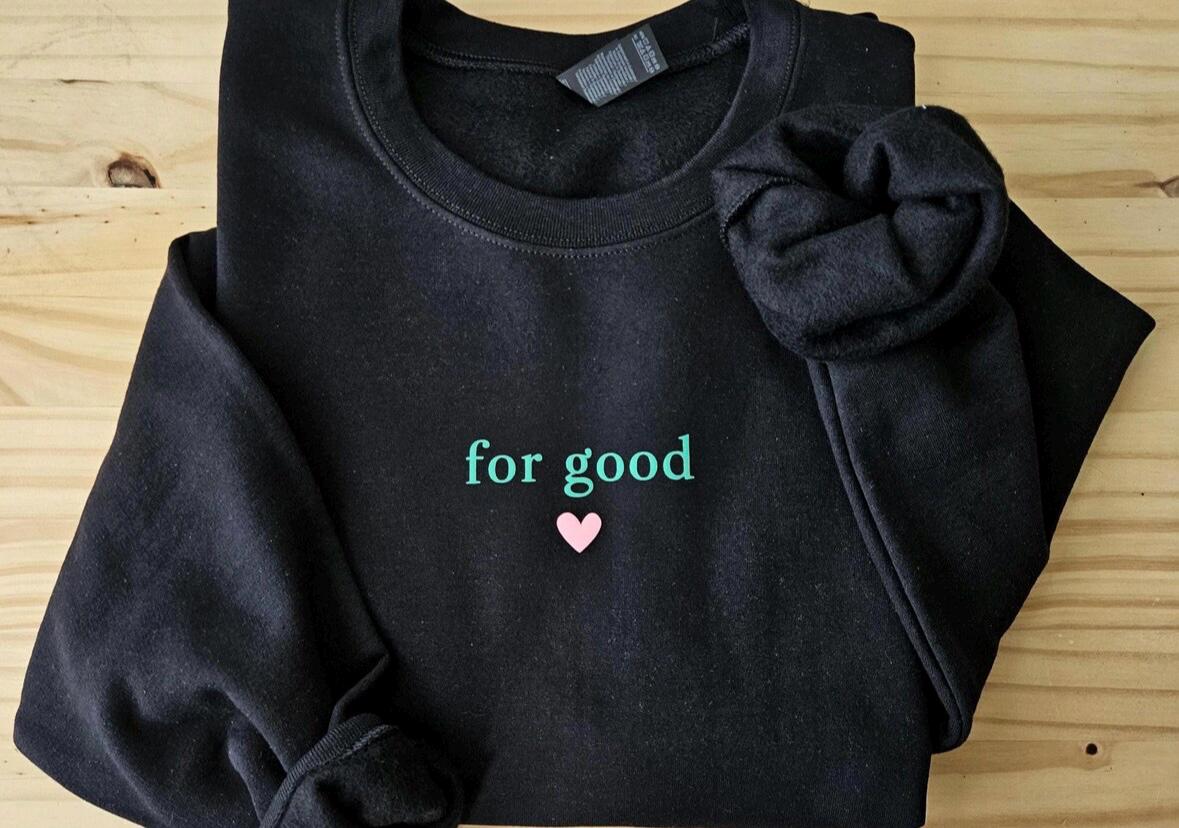 Because some friendships change you for good. 💚💗 Inspired by the iconic song from Wicked, this cozy crewneck is a love letter to best friends, chosen family, and anyone who’s ever changed your life in the most magical way. Minimal, soft, and effortlessly meaningful — this sweatshirt features the phrase “for good” in soft green lettering with a pink heart, creating the perfect blend of Broadway magic and everyday wearability. Whether you’re gifting your theater bestie, your sister, your soulmate friend, or treating yourself, this sweatshirt is a reminder that some people stay with you… for good. These sweatshirts price of $39.99 per sweatshirt.