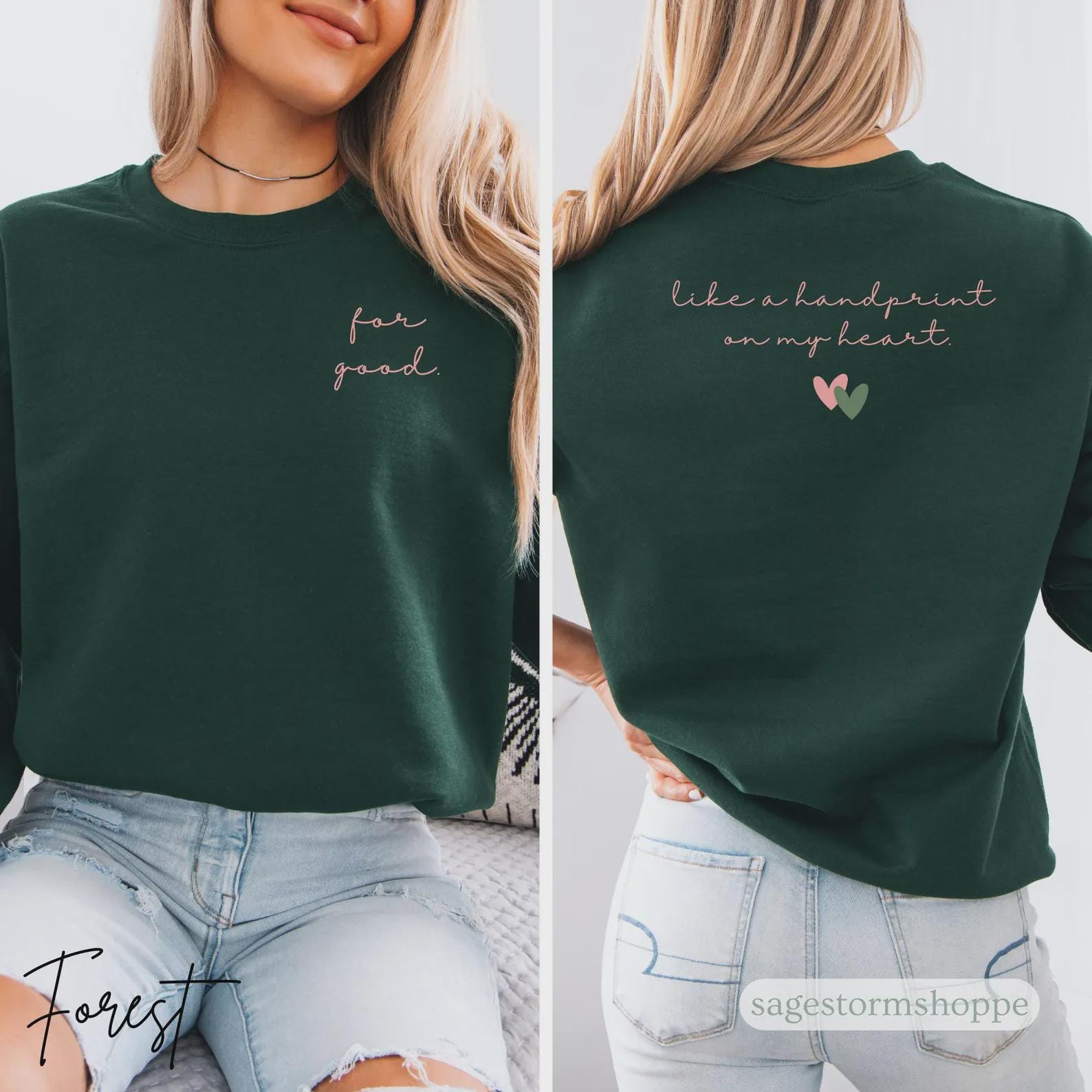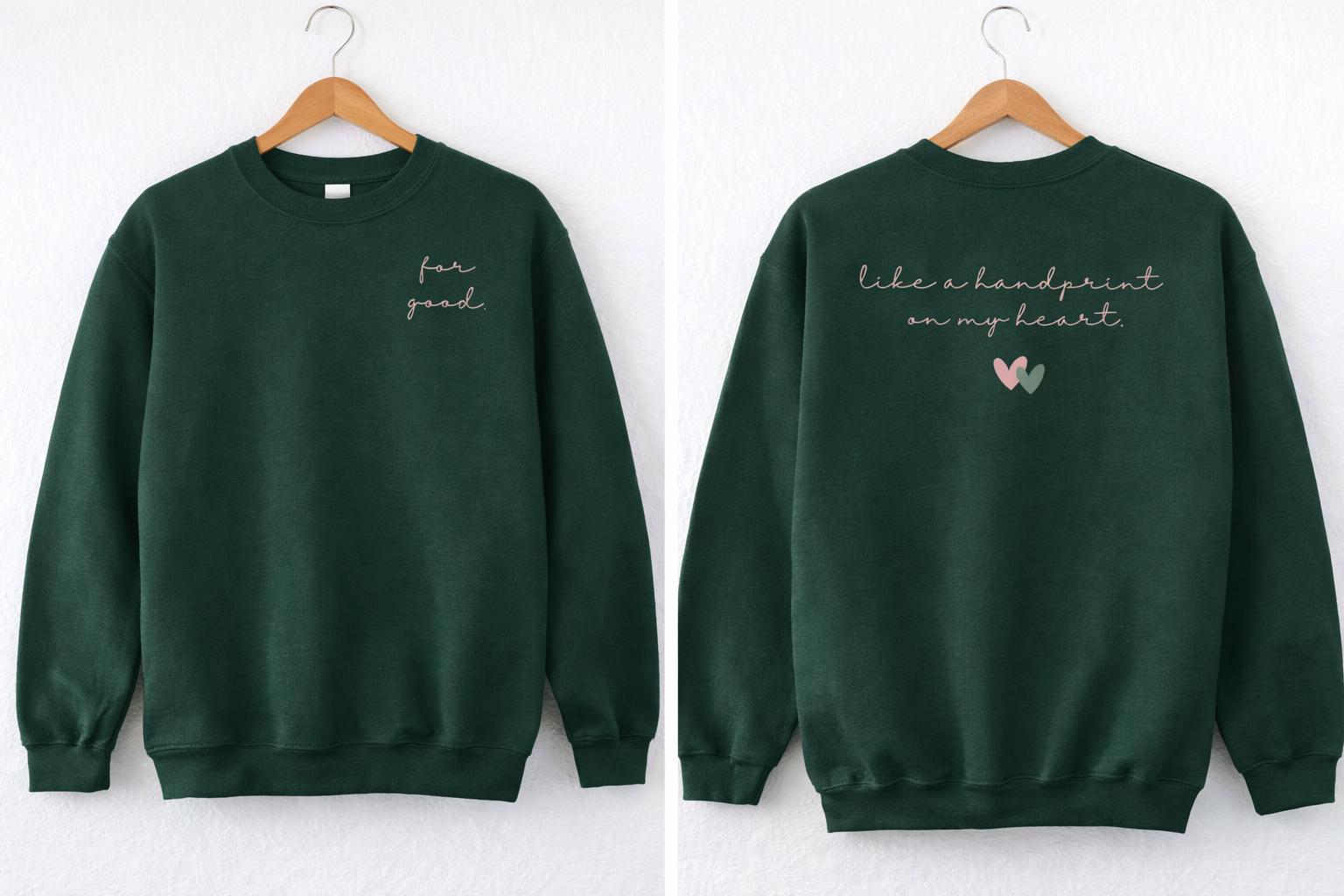 A cozy reminder that small things matter 🤍 This minimalist “for good.” sweatshirt features a delicate front script and a meaningful back message: “like a handprint on my heart.” with a subtle heart detail. Soft, timeless, and effortlessly wearable, this sweatshirt is designed for everyday comfort with a message that lingers. Perfect for layering, lounging, or gifting to someone who leaves a lasting imprint. ✨ Design Details • Front: small script text “for good.” • Back: “like a handprint on my heart.” with heart graphic • Clean, minimalist aesthetic • Soft forest green tone (perfect year-round) 👕 Sweatshirt Details • Unisex adult crewneck • Soft cotton/poly blend • Cozy fleece interior • Relaxed, everyday fit • Professionally printed (not vinyl) 🎁 Perfect Gift For • Best friends • Teachers • Therapists • Caregivers • Moms • Thoughtful “just because” gifts • Anyone who believes in kindness & connection 📏 Sizing Unisex fit. • True to size for a relaxed look • Size up for an oversized, cozy fit (Please see size chart in photos.) 🧼 Care Instructions • Wash inside out • Cold water • Tumble dry low or hang to dry • Do not iron directly on design 💛 Made to Order Each sweatshirt is made just for you to ensure quality and care in every detail.