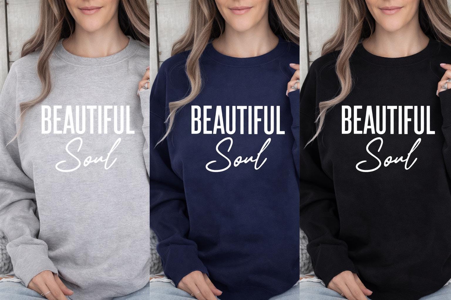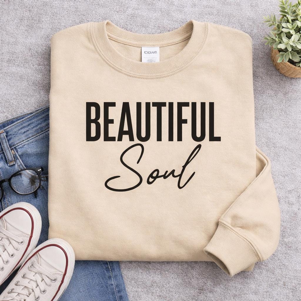 ✨ Wear your reminder of self-worth every day. This Beautiful Soul sweatshirt is designed to inspire confidence, positivity, and self-love. Featuring a bold “Beautiful Soul” design with modern typography, this cozy crewneck is perfect for everyday wear, lounging, or sharing a meaningful message with the world. Whether you're gifting someone special or treating yourself, this sweatshirt is a beautiful reminder that your soul, your kindness, and your spirit matter. Perfect for: • Mental health advocates • Self-love reminders • Inspirational daily wear • Thoughtful gifts for friends or family • Cozy everyday outfits Sweatshirt Details • Premium Gildan Unisex Crewneck Sweatshirt • Soft cotton / polyester blend • Classic relaxed fit • Durable, high-quality print • Ribbed collar, cuffs, and waistband • Pre-shrunk fabric for long-lasting wear Super soft, cozy, and designed to become your new favorite sweatshirt. Available Colors • Dark Heather • Navy Blue • Tan / Sand • Black Sizes Available Unisex sizing (true to size) Small Medium Large XL 2XL 3XL For an oversized look, size up. Care Instructions • Turn garment inside out • Machine wash cold • Tumble dry low • Do not iron directly on design • Do not dry clean This will keep your sweatshirt looking great for years. Processing & Shipping Processing time: 1–3 business days Shipping time: USA: 3–6 business days Each item is made to order to ensure quality and reduce waste. Perfect Gift For • Self love gift • Birthday gift • Best friend gift • Christmas gift • Mental health awareness gift • Inspirational clothing lovers Why Customers Love This Sweatshirt ✔ Comfortable everyday wear ✔ Meaningful message ✔ Stylish modern design ✔ Perfect gift idea ✔ Cozy and durable fabric