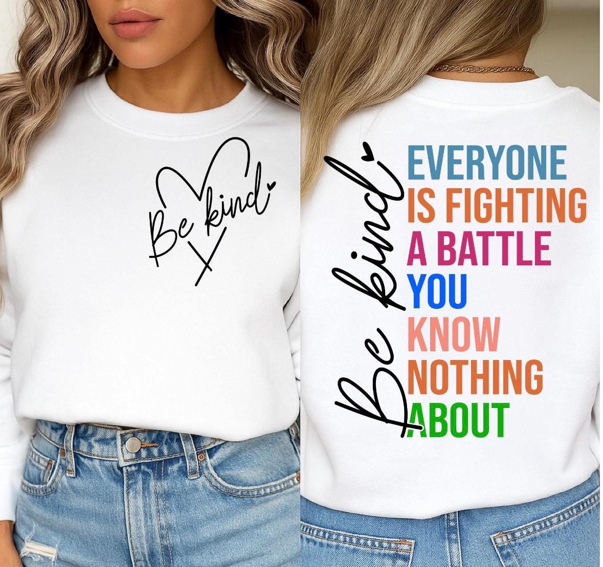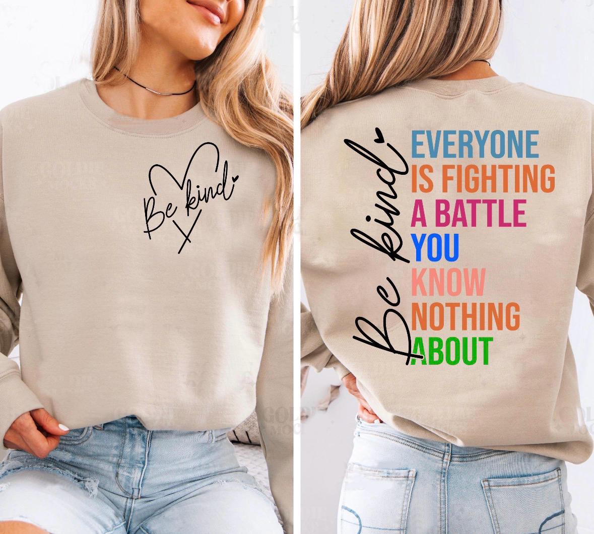 Spread kindness and wear a meaningful message with this Be Kind oversized Gildan crewneck sweatshirt. Featuring a simple heart design on the front and a bold statement on the back, this cozy sweatshirt is a stylish reminder that everyone is fighting a battle you know nothing about. Perfect for everyday wear, this sweatshirt combines comfort and purpose. The oversized fit makes it easy to pair with jeans, leggings, or biker shorts for a relaxed, effortless look. It also makes a thoughtful gift for friends, teachers, therapists, mental health advocates, or anyone who loves uplifting apparel with a message that matters. Whether you’re wearing it to school, work, coffee runs, casual outings, or just at home, this sweatshirt offers warmth, comfort, and encouragement all in one. Features Gildan crewneck sweatshirt Oversized, relaxed fit Front and back graphic design Soft and cozy feel Meaningful kindness and mental health message Great for casual everyday wear or gifting Perfect For Mental health awareness gifts Kindness apparel Inspirational everyday wear Teacher gifts Therapist gifts Encouragement gifts Cozy oversized sweatshirt lovers Positive message clothing Product Details Gildan crewneck sweatshirt Unisex fit Oversized look when sized up Soft cotton/poly blend Professionally printed design Ribbed cuffs and waistband Comfortable for layering in cooler weather